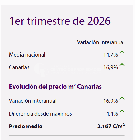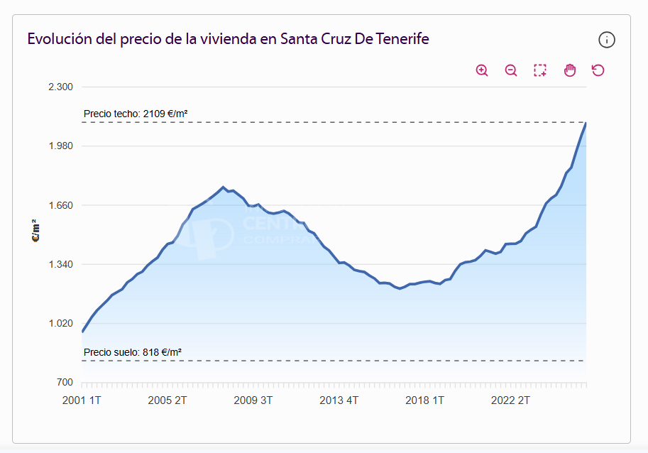 Según datos publicados por Tinsa by Accumin, recogidos también por Expansión, el precio medio de la vivienda en Santa Cruz de Tenerife alcanzó los 2.109 euros por metro cuadrado en el primer trimestre de 2026, registrando una subida interanual del 15%, uno de los crecimientos más destacados del mercado residencial.